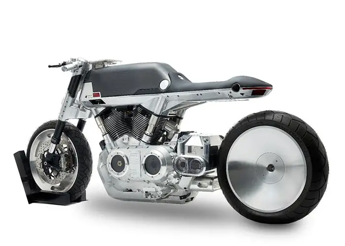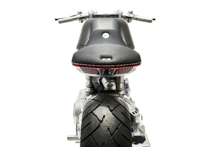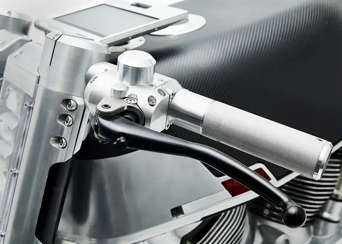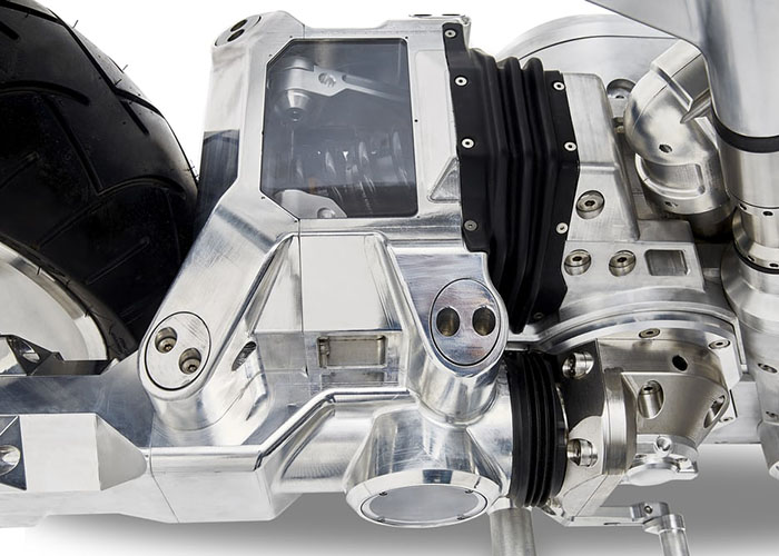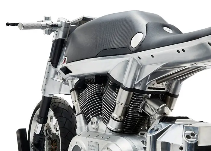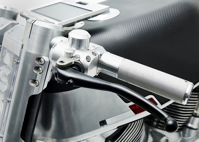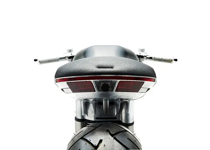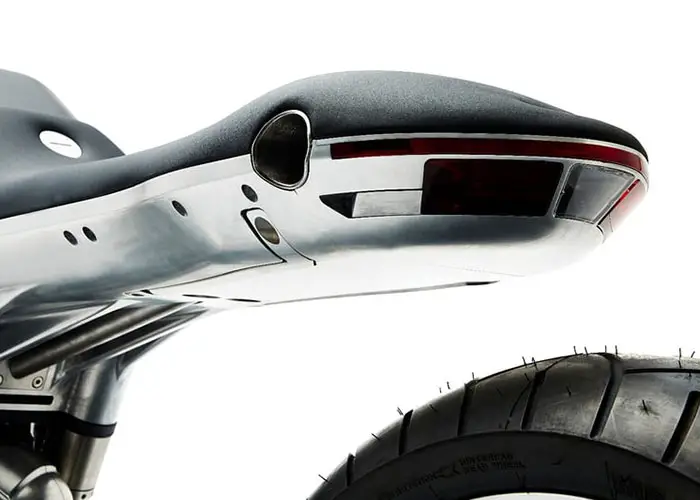 También es posible que nos suene su diseño a una compañía en particular, como si no nos hubiera extrañado que su marca fuera Confederate Motorcycles. Teniendo en cuenta que los responsables de su diseño trabajaban antes en la marca de Alabama, sería casi un acierto. Al igual que las motos de Confederate, mantiene la imagen de naked con mucho músculo y con un acento especial en parecer diferente desde la primera mirada, tanto por distribución de elementos como por los materiales utilizados. Fibra de carbono en el depósito, instrumentación mediante tablet, que también nos servirá de retrovisor, puesto que nos mostrará las imágenes que manda una cámara montada en la estructura posterior, que integra en asiento y la doble salida de escape, destacando por encima del gran basculante posterior donde montan tanto la suspensión trasera como la transmisión.