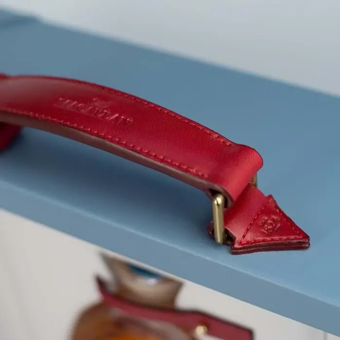 Para completar su presentación, llega en un elegante maletín azul cielo con detalles en piel roja que evoca los uniformes de las azafatas y las pequeñas maletas de equipaje de mano.