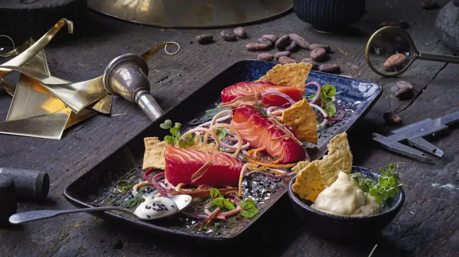 En Mövenpick añaden a su delicioso salmón marinado un toque de chocolate suizo al 72% de cacao, es chocolate negro.
