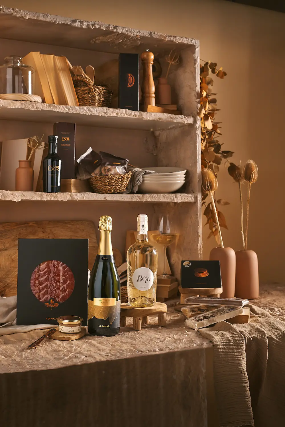 ¿Qué más encontrarás en los packs de Navidad de Vegamar? Vermouth Oh lalá!, cava Vegamar Privée, Ancestral blanco y rosado, vino blanco Huella de Merseguera o Beio Godello, Huella de Garnacha o Syra si hablamos de tintos; ibéricos como el jamón 100% ibérico de bellota o el lomo ibérico; conservas Herencia del Mar como zamburiñas en salsa de vieira o mejillones de las rías gallegas en escabeche, también Herencia de la teirra como los espárragos o los corazones de alcachofa.