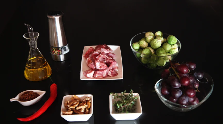 → 1 / 11Ingredientes: 24 coles de Bruselas, 24 uvas negras, 250 gramos de magro de cerdo, 1 chile rojo, 2 cucharadas de azúcar integral de caña, 1 puñado de nueces, 3 cucharadas de hojas frescas de tomillo, ¼ vaso de vino tinto, crema de vinagre balsámica, aceite, sal y pimienta.
