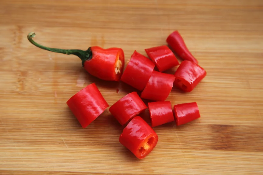 → 3 / 11Cortamos en rodajas gruesas el chile rojo, que nos dará ese toque picante tan delicioso. Si alguno no sois amantes del picante, sencillamente suprimirlo.