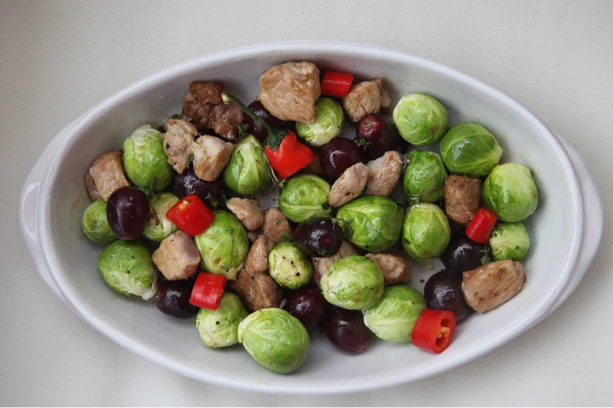 Para los enamorados de esta crucífera hoy voy a cocinar mi receta personal de coles asadas al horno con jugosas uvas negras, picante chile rojo, tierno magro de cerdo, verdes hojas de tomillo, deliciosas nueces tostadas, todo ello rociado con vino tinto y un cordón de crema balsámico. Cocinar todos los ingredientes en la misma fuente hará que compartan todos sus aromas obteniendo un sabor realmente grandioso.