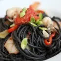 Receta: Espagueti negro con gambas, sepia y copos de chile.