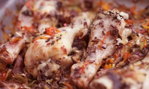 Receta paso a paso: Muslos de pollo con fideos de verduras y semillas de mostaza.