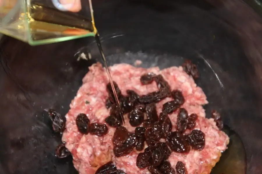 → 4 / 9Seguidamente continuaremos con la farsa o relleno, mezclando la carne picada sazonada, las uvas pasas y el ron.
