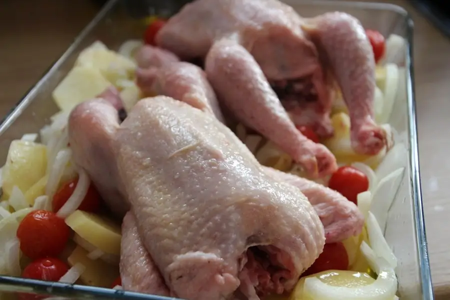 → 1 / 92 Picantones, 5 patatas nuevas, 1 cebolla, 400g de carne picada tipo hamburguesa aliñada, 100g de uvas pasas, 1 pera, 1 vaso de ron, tomates Cherrys, sal, pimienta y clavos. Chorrito de aceite de oliva.