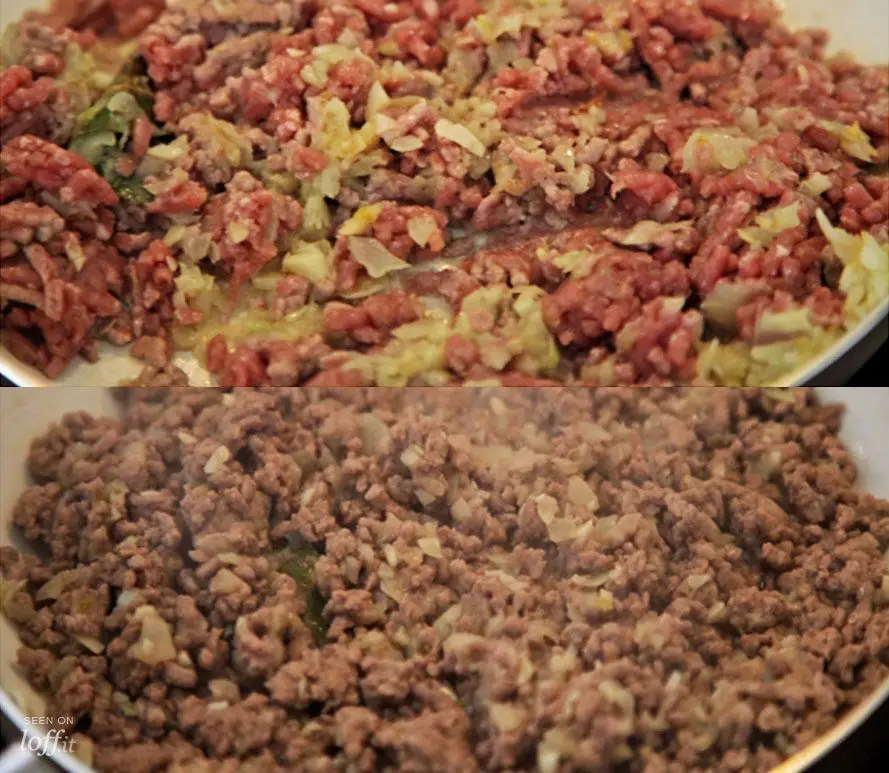 Cuando esté lista la cebolla y el ajo, incorporamos la carne picada y la hojita de laurel. No dejéis de mover con una cuchara de madera para que la carne no se apelmace. Freírlo todo muy bien, hasta que la carne cambie de color.