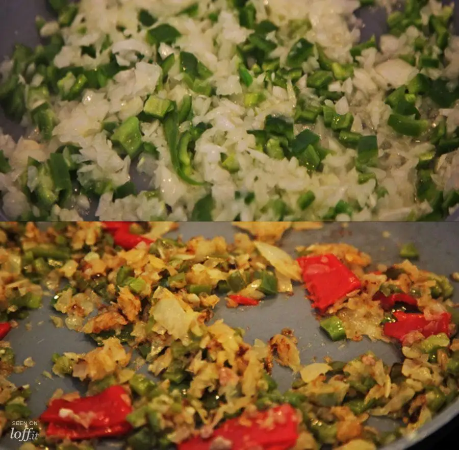 Mientras enfría la carne, ponemos a freír la segunda cebolla con el pimiento verde.