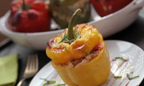Si hay recetas que enamoran, sin lugar a duda la que hoy os traigo os va a seducir. Todos éstos ingredientes cocinados con el cariñin que merecen, convierten a éste plato directamente en un ‘number one‘ de tu mesa. Si no, juzgar vosotros mismo cocinándolo en casa, o, si sois capaces de leer y saborear con la imaginación, contadme que os sugieren: Unos pimientos morrones rellenos de frescos y crujientes vegetales, sabrosas setas de rebozuelo, tierno pollo de corral, quinoa biológica perfumada con ajo, un toque de aromática albahaca, el inconfundible parmesano, y un puntito de sal del himalaya. Pero espera, no te olvides presentar esta delicia sobre un plato pintado con crema de vino tinto. ¡Ufff…, ¿suena rico…. eh?, pues imagina como debe saber.