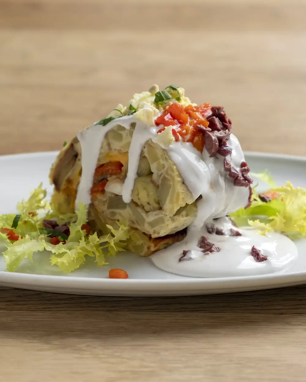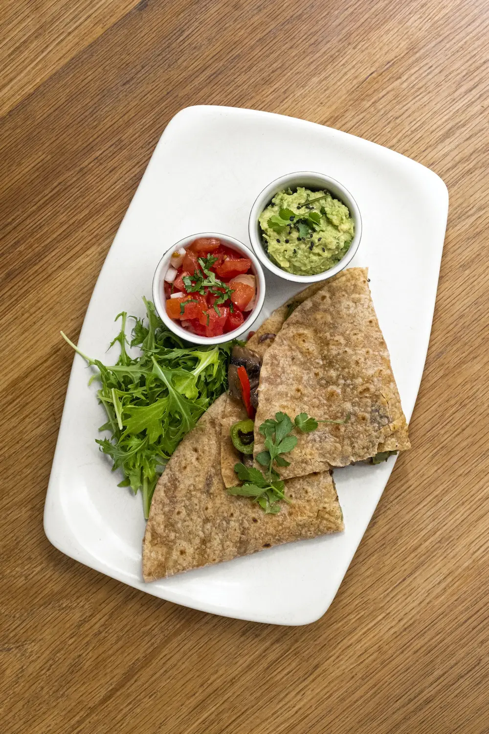 En los segundos la variedad es todavía mayor: rollo de tortilla de patatas relleno de pimientos y berenjenas escalivados con queso y mayonesa suave de soja; guiso de lentejas al curry; quesadilla de espelta, cebolla, pimiento, champiñones y queso emmental con guacamole y pico de gallo; fideuá a la marinera o canelones de champiñones y mató.
