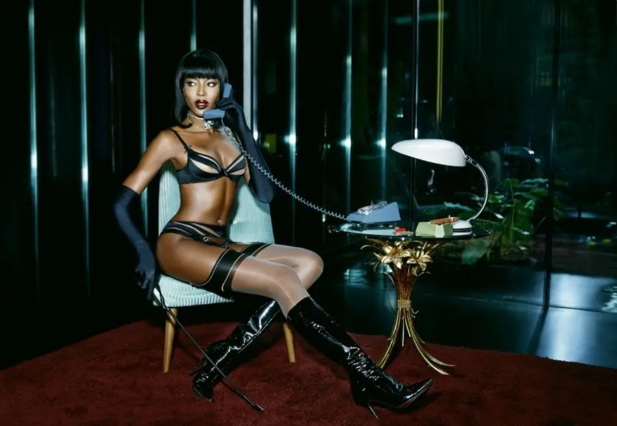 Naomi se muestra así como rostro y cuerpo de una de las firmas lenceras más atrevidas y provocadoras que, sobre la piel de la Campbell, gana elegancia y encanto a raudales.
