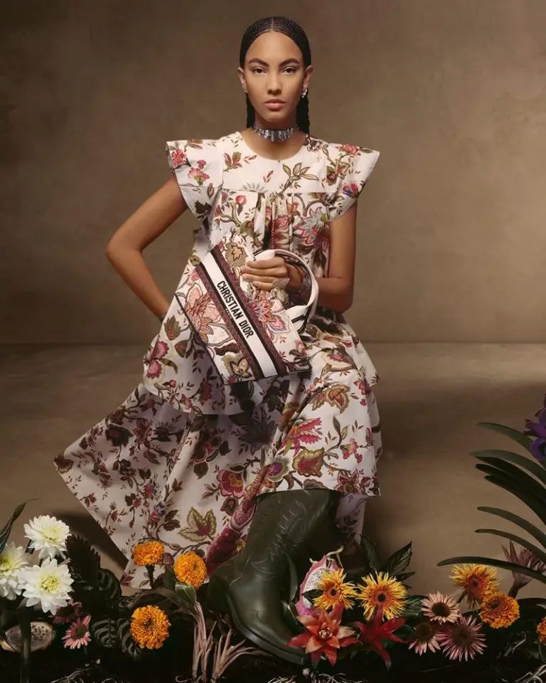 No es la primera vez que Maria Grazia Chiuri se inspira en México, ya lo hizo en 2019, pero ahora va un paso más allá y nos sorprende proponiento faldas amplias con chaquetas a medida adornadas con guipures y huipiles tradicionales (prendas que han sido diseñadas en colaboración con artistas mexicanos), con bordados de mariposas, estampados naturales… y por supuesto todo ello debidamente complementado con los bolsos Dior.