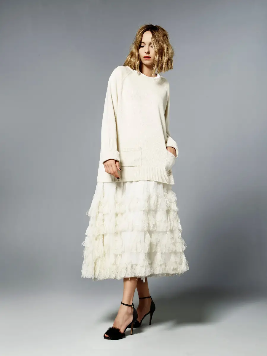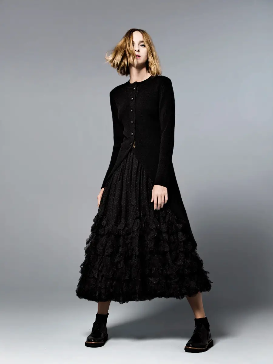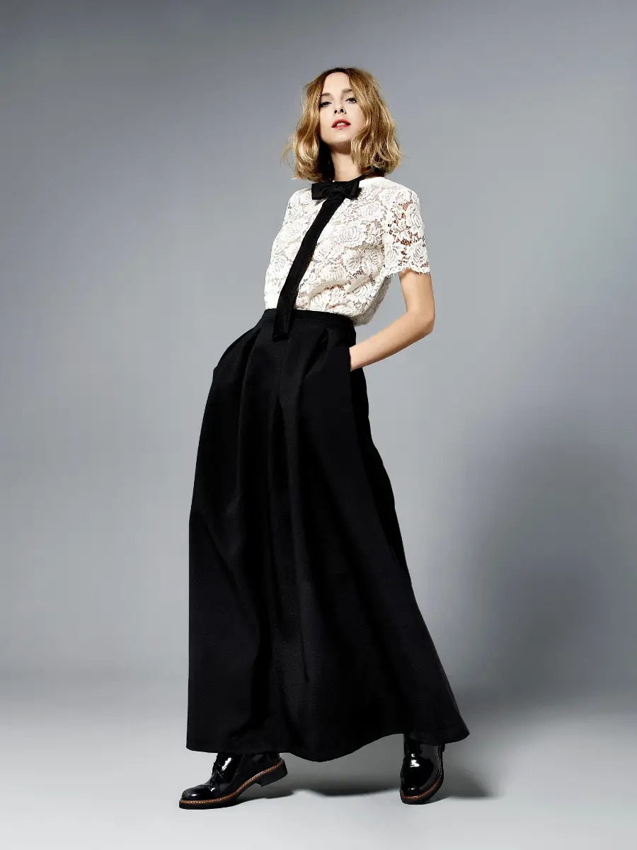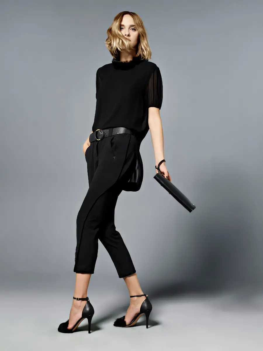Twin-Set gira entorno a dos colores básicos: la pureza del blanco y la elegancia del negro. Todos los diseños en delicados tejidos adornados como crepe que le dan definición y forma y detalles como solapas de organza y cuellos de lavin.