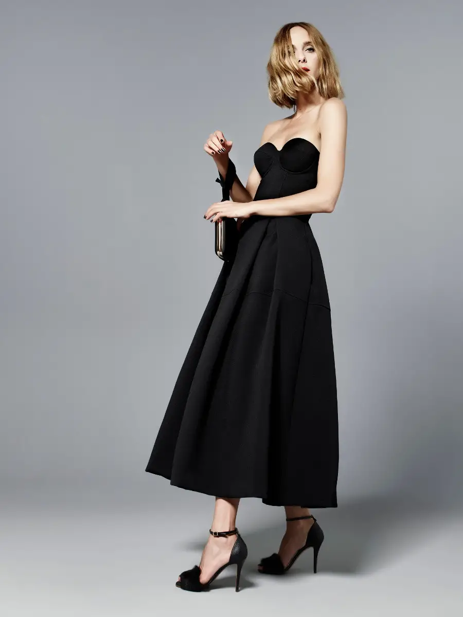 Hay distintos modelos de vestido, para utiliza en horario de cóctel o en la noche; algunos de escote palabra de honor, otros con corte camisero y volumen en la falda. Otros de los modelos destacan por los volantes de gasa o por las transparencias en el escote y no faltan los pailletes en tonos dorados para ocasiones especiales.
