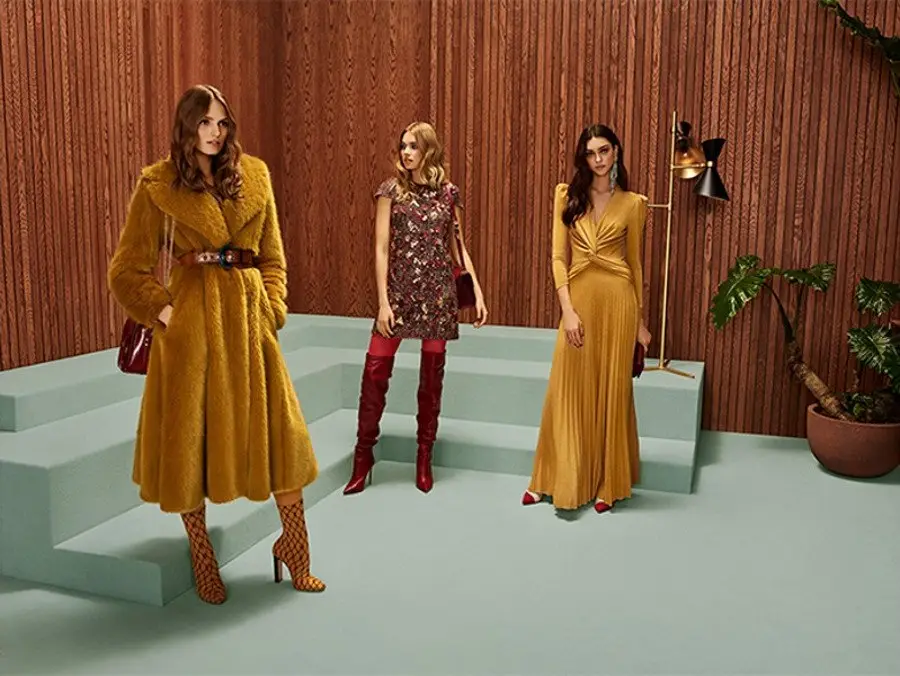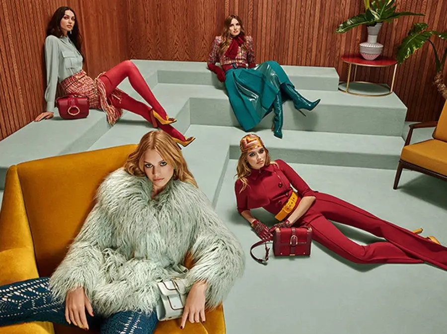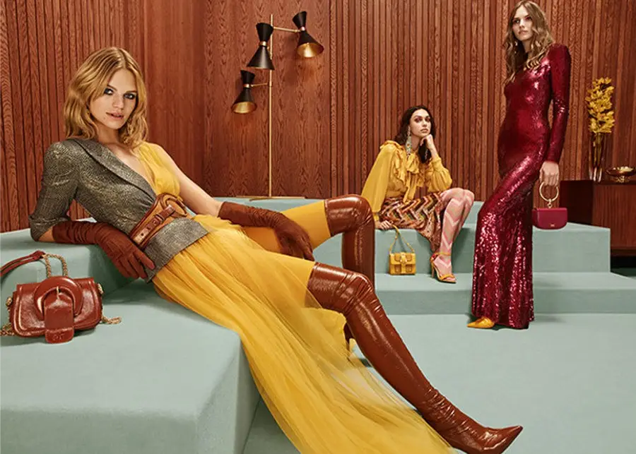 Las modelos aparecen recostadas en suaves sofás o moquetas, o desfilan esculturales en escenarios setenteros. En esta colección lucen pantalones acampanados con ajustados jerséis de punto con cuellos polo y cinturones ceñidos en contraste. Las faldas son muy mini o midi y se combinan con blusas de lazada y abrigos de pelo largo. Los tejidos de twed y los vinilos son protagonistas de esta colección: botas mosqueteras y a medio muslo y pantalones de alta cintura están hechas de este material.