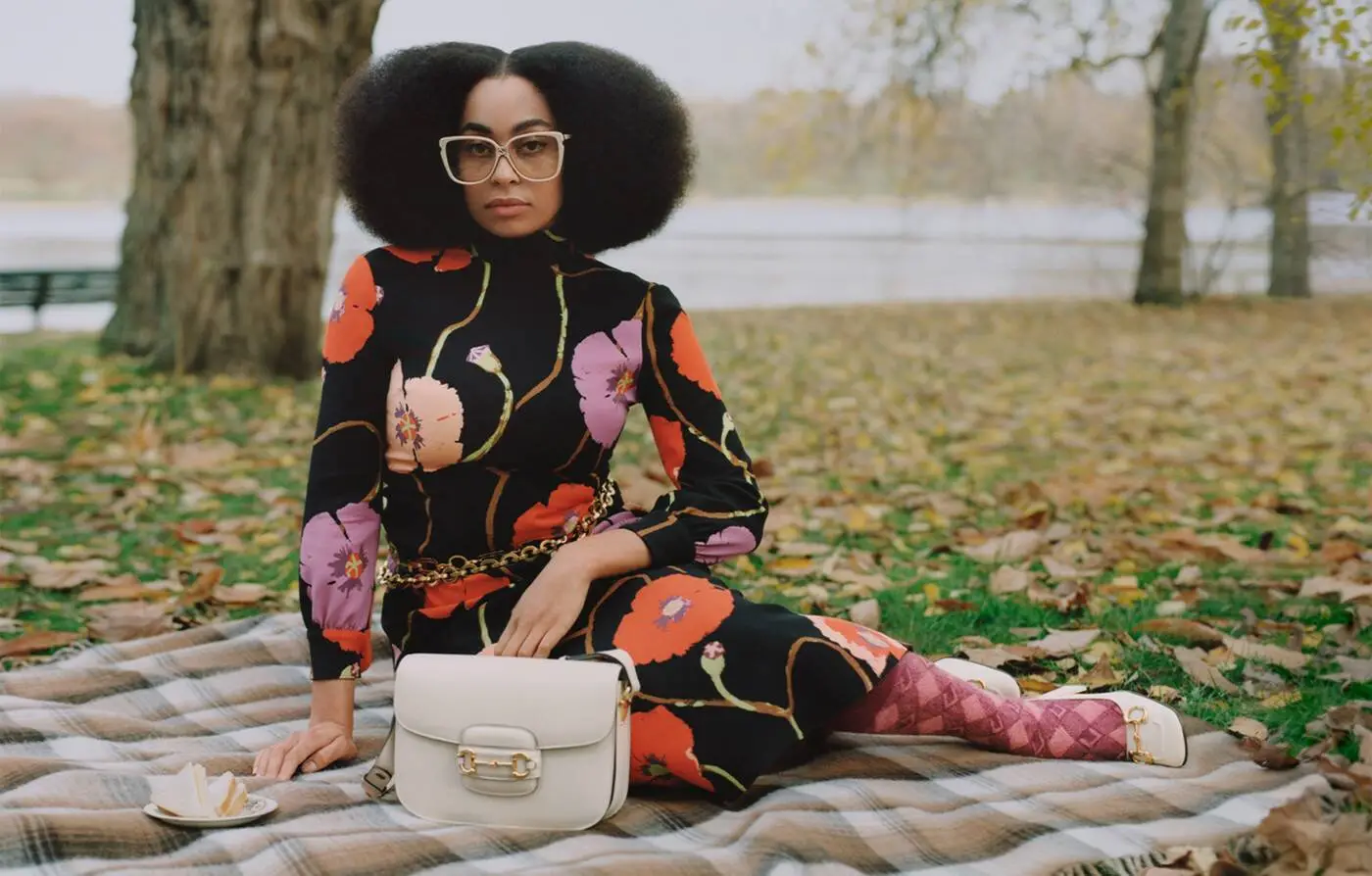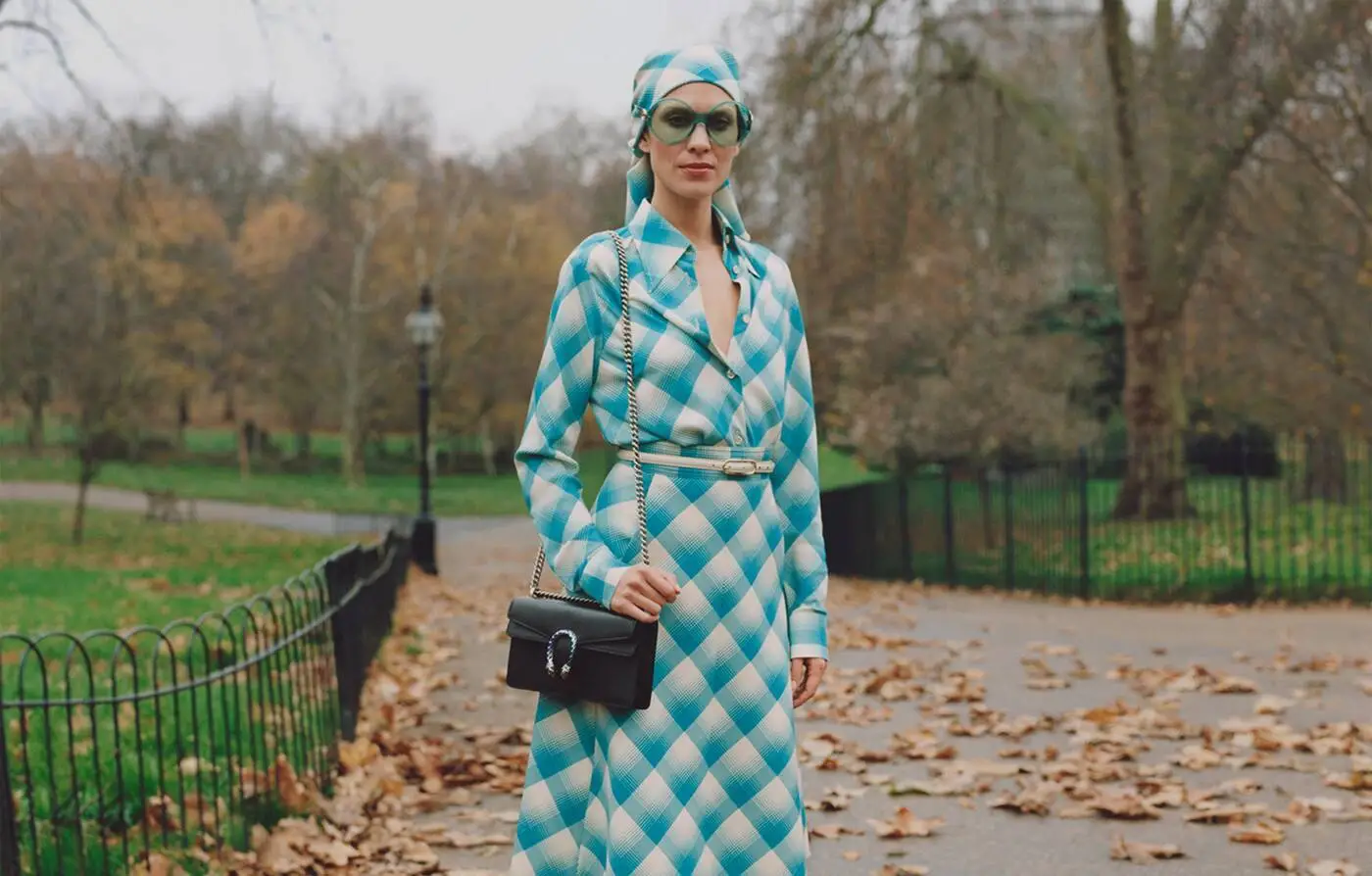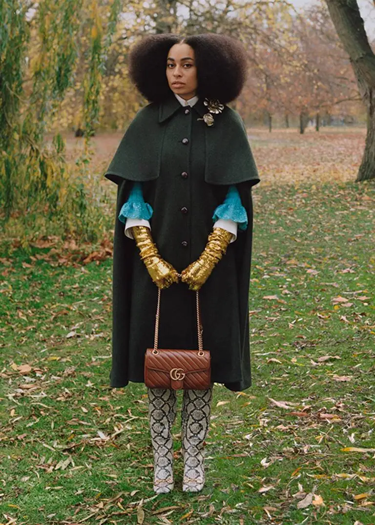 La cantautora Celeste, la modelo y diseñadora Alexa Chung y la actriz Vanessa Kirby pasean por Hyde Park, el parque más famoso de Londres, perfectamente vestidas y complementadas por Gucci; viéndolas no podemos evitar pensar que están ahí, en Londres y en un otoño cualquiera de hojas caídas y parques en tonos ocre, en Hyde Park y en el S.XXI pero si nos dijesen que son en realidad imágenes del famoso parque inglés en los años 70 lo creeríamos sin dudar, tal es el grado de inspiración setentera con el que nos deleita Gucci.