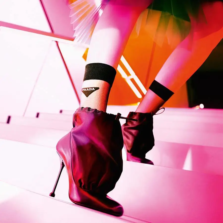 Los protagonistas fundamentales de esta colección son los botines flojos que se ajustan y abolsan gracias a cordones que se fruncen a media pantorrilla. Una propuesta que sigue apostando por los calcetines blancos con el logo de Prada debajo de sandalias de tacones incendiarios.