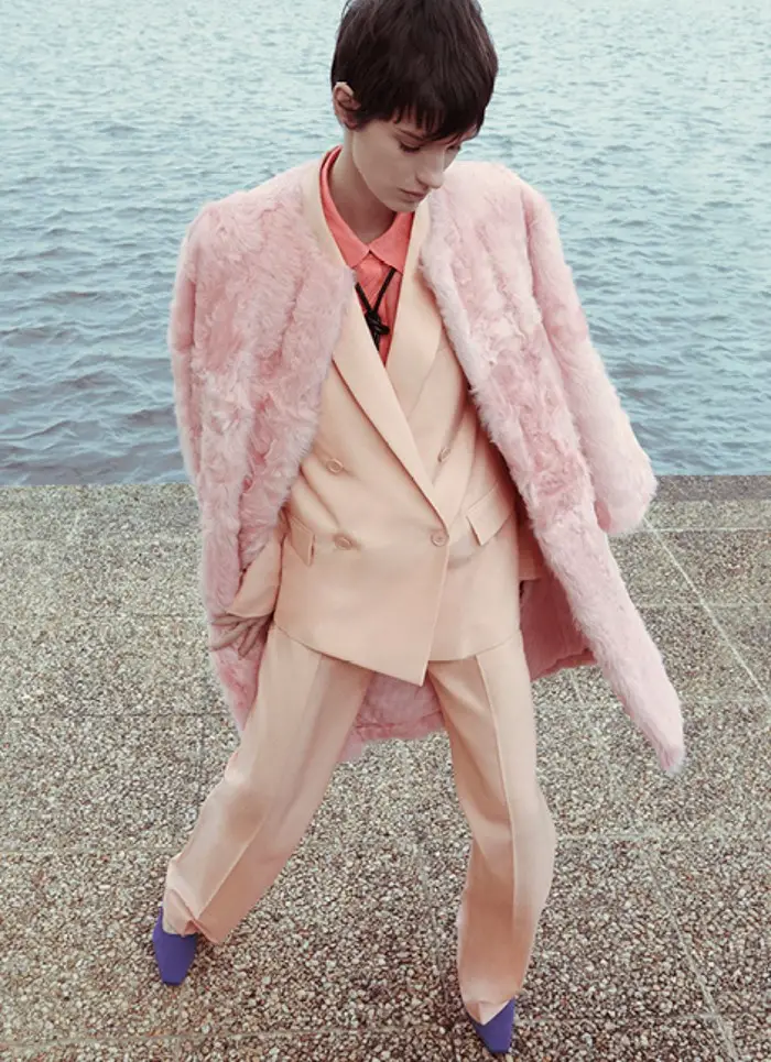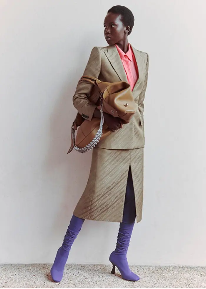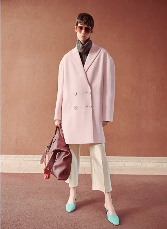 Nos llena un armario para la oficina con trajes de chaqueta estructurada con grandes hombreras y solapas cruzadas que combina con pantalones rectos y faldas tubo; una propuesta muy actual y también atemporal para los días de trabajo. En todos ellos priman los colores claros: rosas, beiges y caquis.