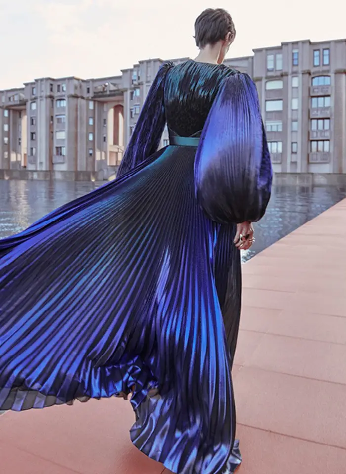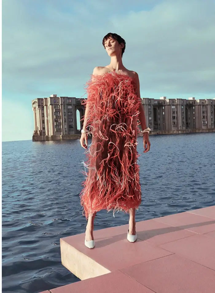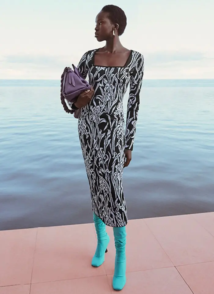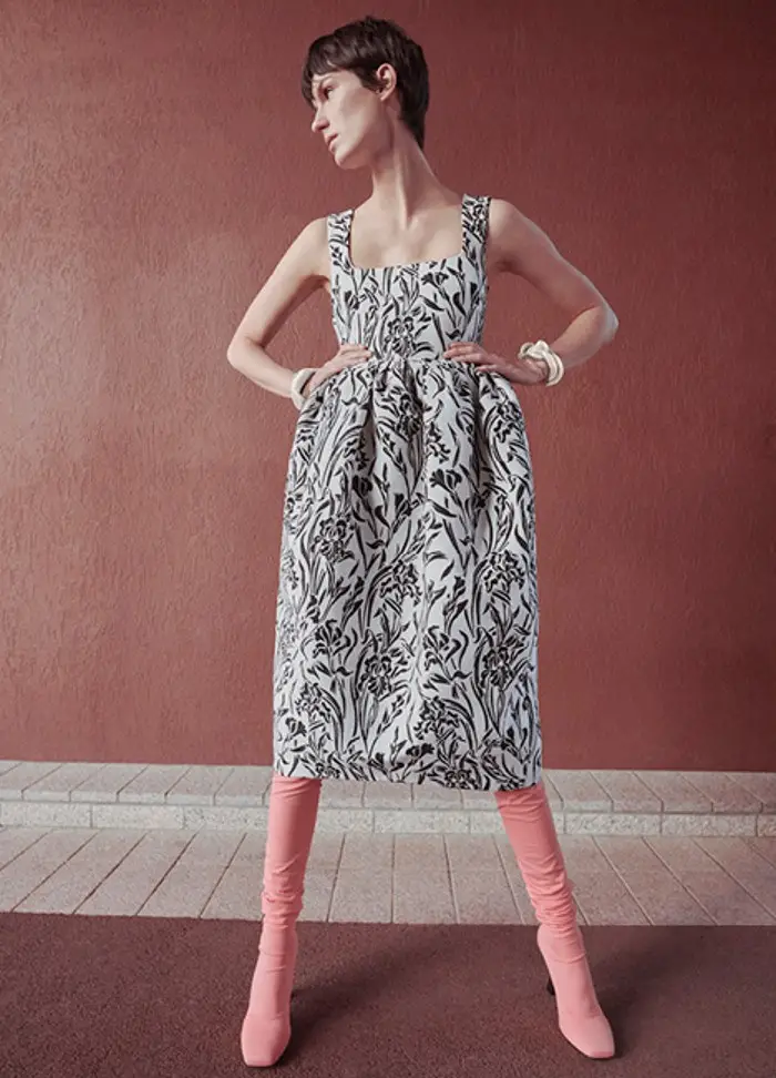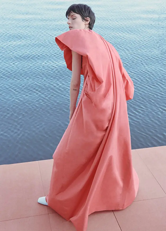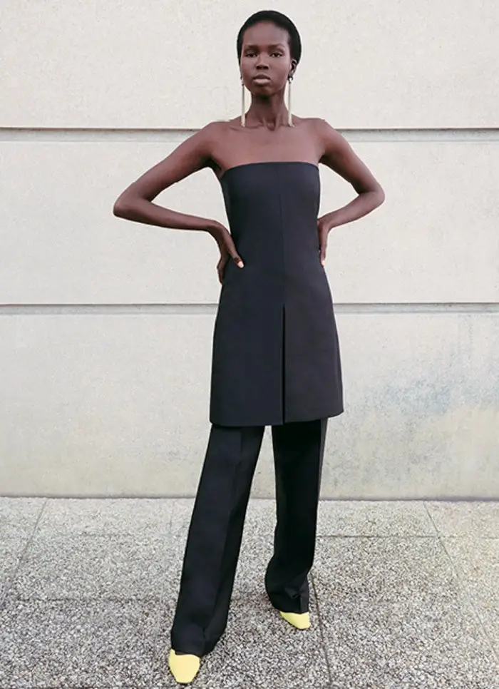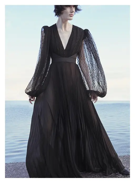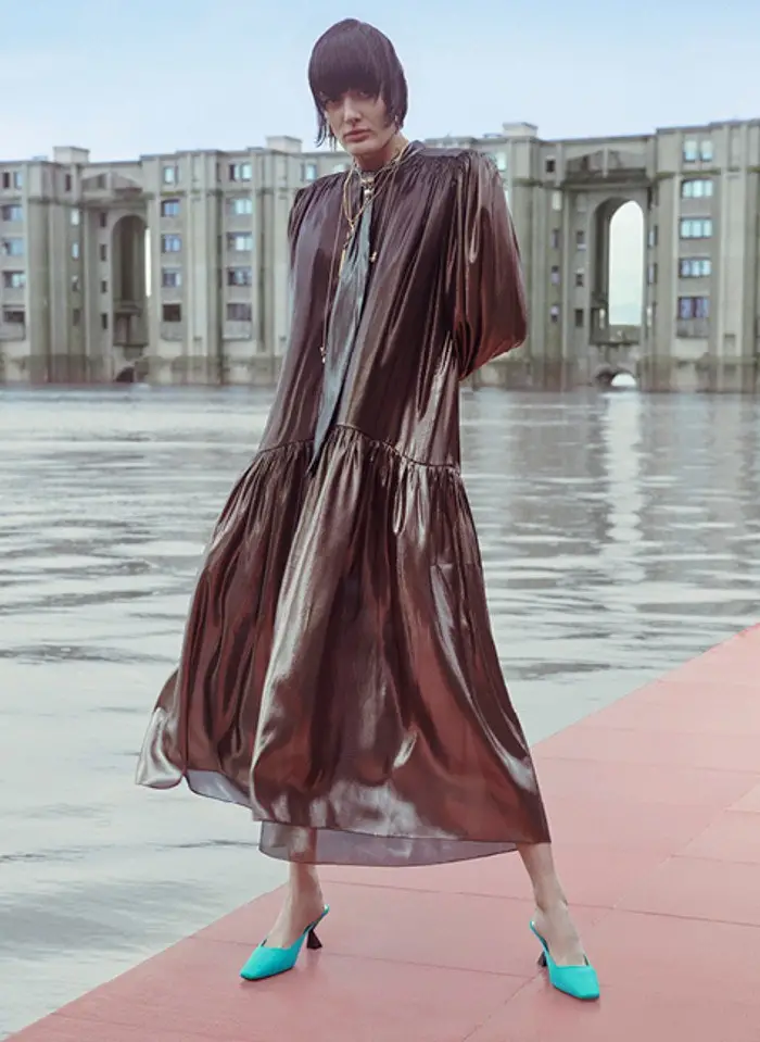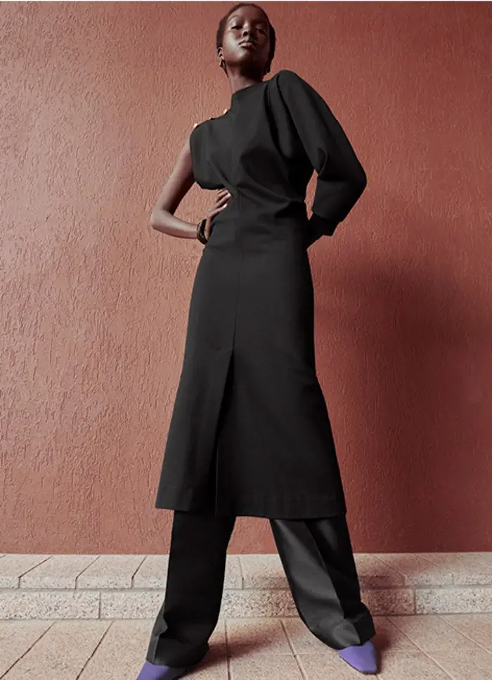 También apuesta por vestidos rectos, con detalles novedosos. Utiliza aberturas estratégicas y centra la atención en el volumen en los hombros: mangas abullonadas y hombreras que aportan estructura.