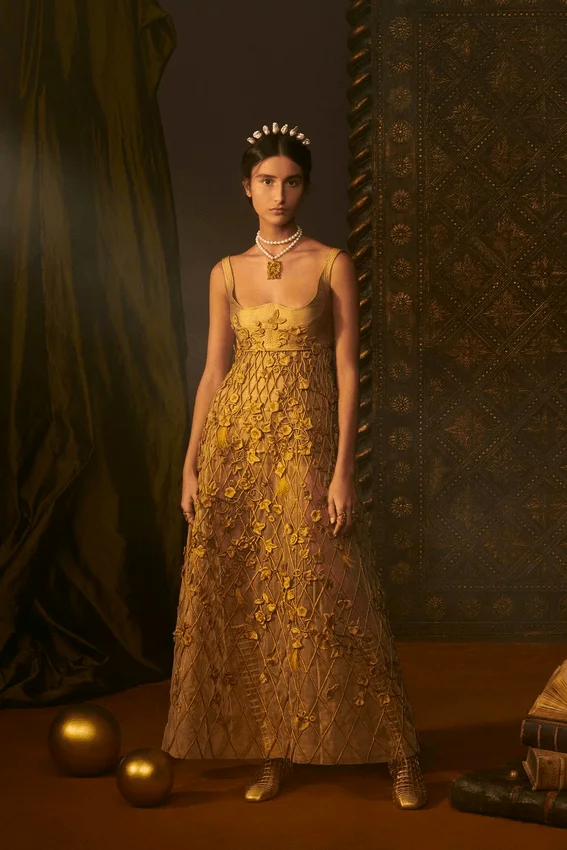 Los vestidos y conjuntos que sugiere Maria Grazia Chiuri en esta colección de alta costura de Dior son verdaderas joyas: corpiños calados, cachemiras, organzas, capas, terciopelos, encajes imbricados… un mundo de belleza que solo podía presentar Dior.