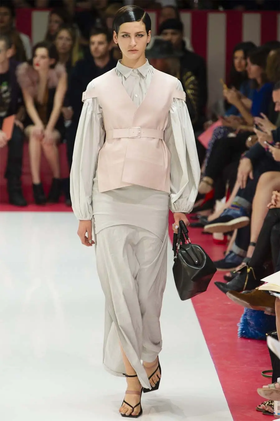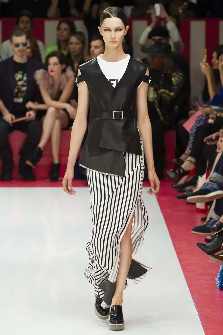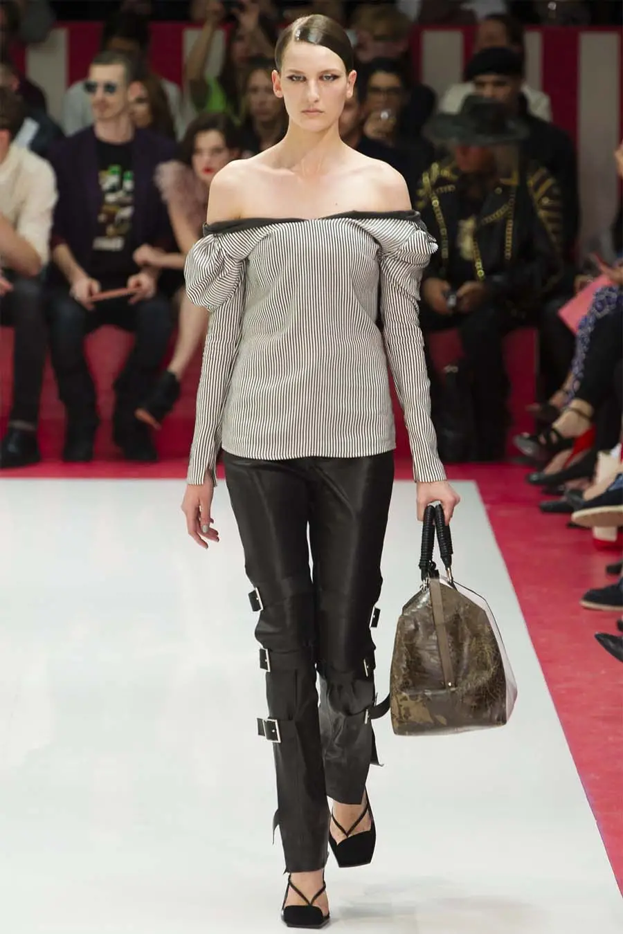 Jonny Johansson utiliza las camisetas básicas de algodón como lienzo donde expresar que la música es todo lo que rodea su éxito. Y así, la pasarela fue envolviendo con ella piezas de cuero y gasa en forma de vestidos y faldas vaporosas o pantalones ajustados donde la hebilla se convertía en el elemento central para definir piernas, brazos, cinturas y caderas. Un cierto aire de asimetría se asoma en pliegues y mezcla de estampados, predominando las rayas, sobre una base cuidada y pulida.
