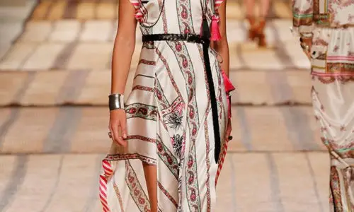 La firma de lujo italiana ha presentado en Milán una colección hiperfemenina y elegante. Llena de deliciosas telas de seda con una caída, que se ajusta al cuerpo marcando la silueta de la mujer de manera sutil. Etro sigue teniendoinspiración de la India, que se nota en las sedas y los estampados y alguno de los diseños con aire de sarí hindú. En este desfile cobran una importancia fundamental las rayas: verticales, horizontales, oblicuas… y se combinan entre ellas o con telas estampadas; una combinación imposible pero que Etro la hace realidad.
