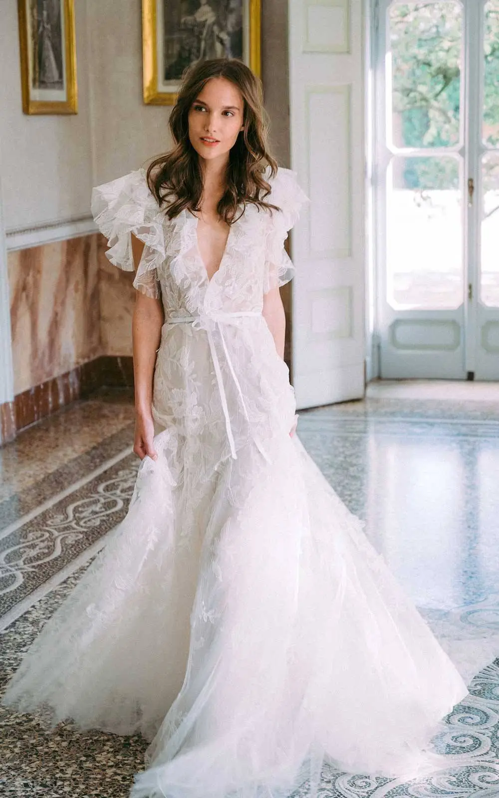 Monique Lhuillier usa telas de gasa, de encaje y de tul –a los que hace cobrar vida como si de flores se tratara-. Los complementos que acompañan los vestidos son versátiles: boleros, capas y velos superiores desmontables que completan cada pieza. Diseños únicos para novias que muestran su individualidad, que no quieren ir uniformadas, que quieren causar impacto en ese día tan especial.