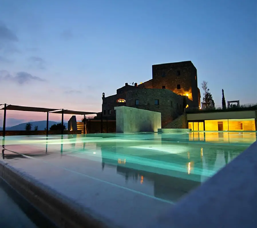 Del antiguo castillo queda la torre de vigilancia, del siglo XII; queda también registro de cómo durante el Renacimiento el castillo se convirtió en villa residencial y de la construcción de la biblioteca, último añadido antiguo. Sobre todo ésto, y tras un cierre de tres años para dar vida a un proyecto único, el Castello de Velona abrió sus puertas convertido en un hotel de 46 habitaciones y suites, un nuevo restaurante con terraza panorámica y un espacio de 1.500 metros de SPA… un lugar de absoluto deleite de los sentidos.
