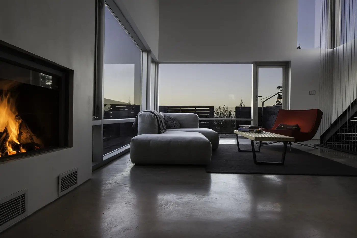Esta casa, que es una casa como una caja, es además el paraíso del autónomo, freelance o, dicho tal cual es, el tipo (o ‘tipa’) que se busca la vida ¿por qué? porque la planta baja es su lugar de trabajo y la superior un moderno loft en el que vivir: la caja baja de Box House es un estudio de yoga y la superior un loft de un dormitorio con vistas y chimenea ¿se puede pedir más?.