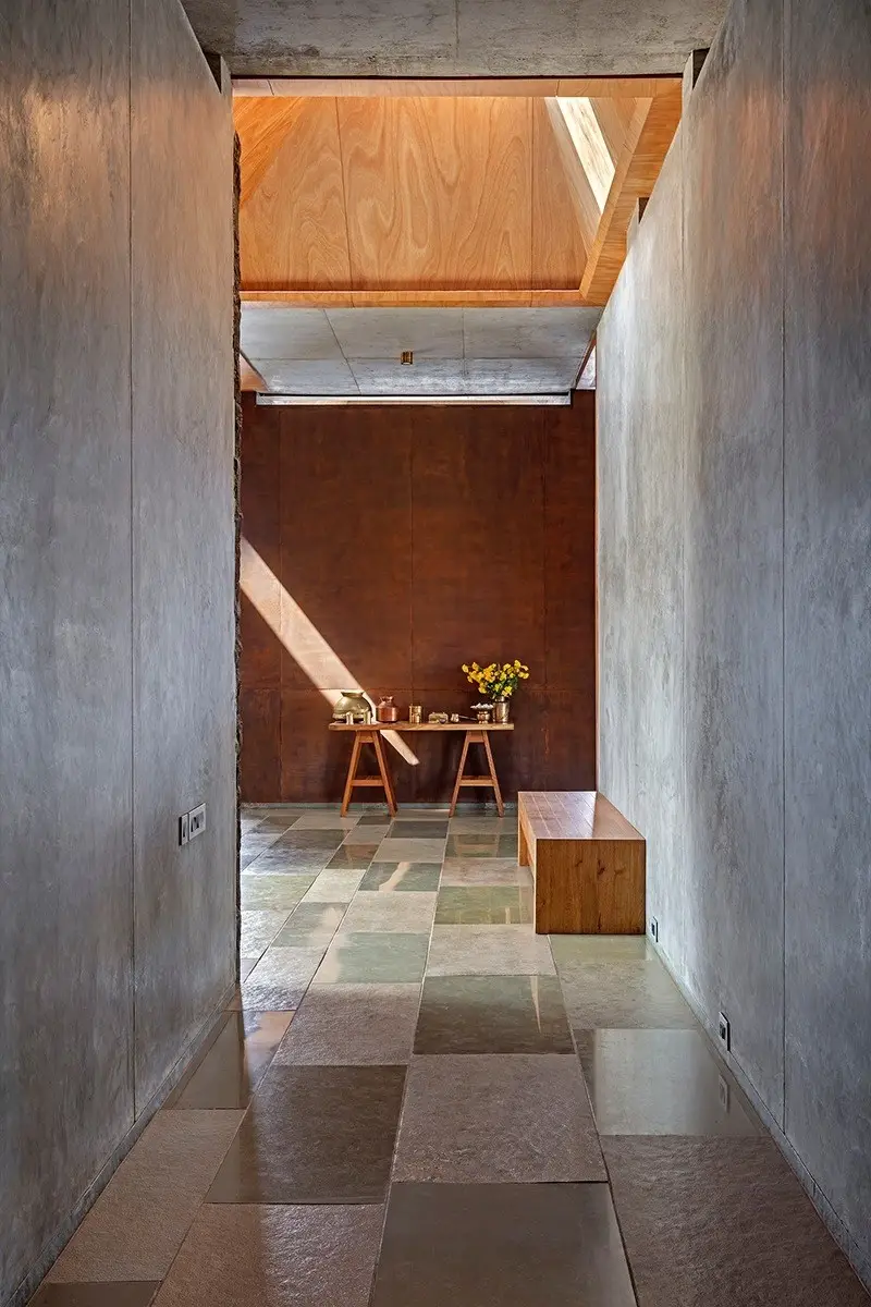 Las zonas más privadas de esta casa con vistas no podían disponer de ventanales tan abiertos porque la idea de sus dueños era disfrutar en esos espacios de una privacidad casi absoluta pero ¿quién estaría dispuesto a renunciar a la luz natural en una casa? nadie, ellos tampoco y por eso el equipo de arquitectos de Khosla Associates ideó un modo de llevar la luz al hogar ocultando su interior ¿cómo? con tres notables tragaluces en el tejado de la casa.