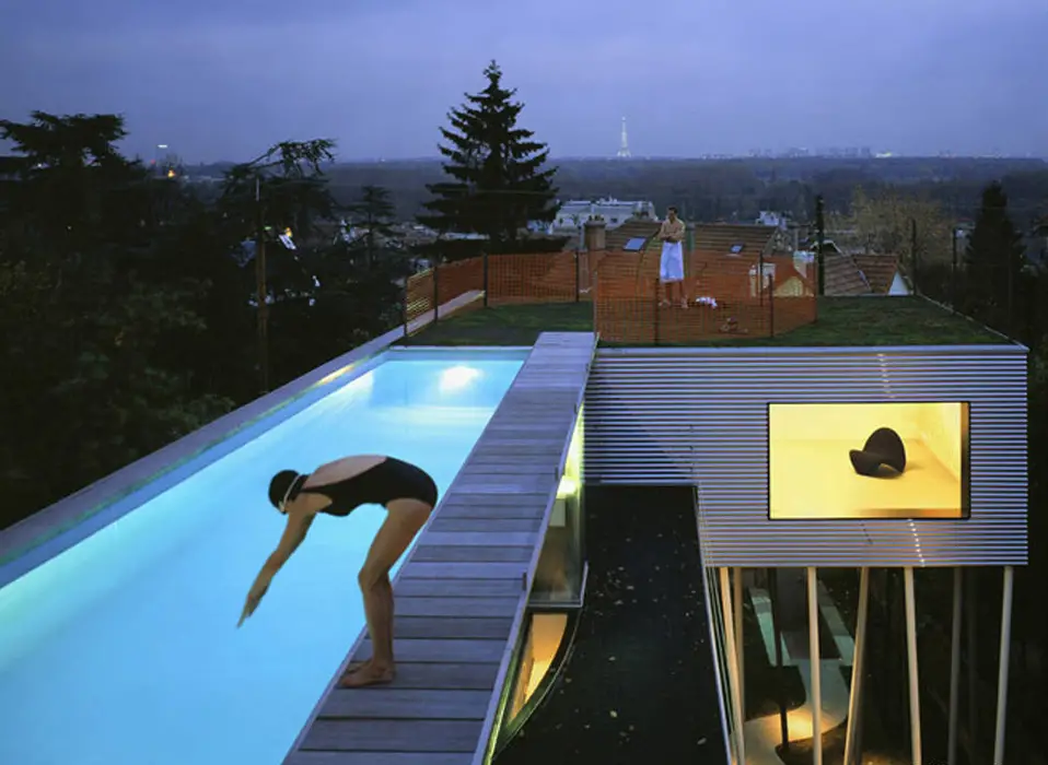 La villa Dall’Ava se sitúa en las afueras de París, en una colina a orillas del Sena. Los clientes, un matrimonio y su hija tenían muy claras las condiciones de partida: una planta baja con alguna zona abierta al jardín trasero y un programa funcional que, entre otras cosas, contemplara la incorporación de una piscina en cubierta, desde la cual disfrutar de las maravillosas vistas de París.