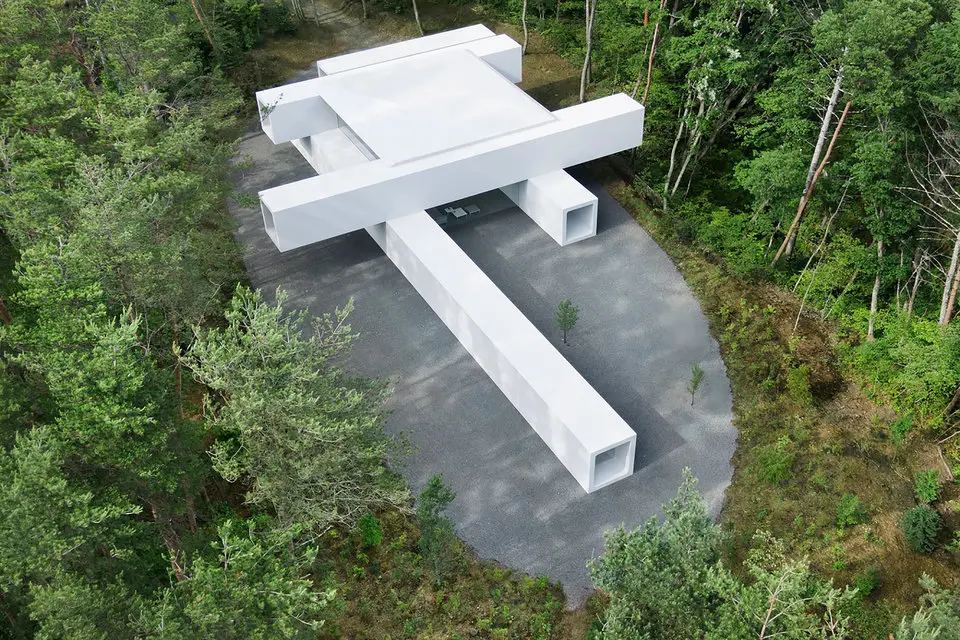 Han sido necesarias 63 piezas cuadradas de 12 toneladas cada una para construir esta casa de huéspedes con su almacén, se usaron además 14 cables para unirlas y, curiosamente, el tamaño y peso de esas piezas no vino marcado por el diseño del Nendo sino por el peso y volumen máximo que podían moverse en camión y manejarse con grúa para llevar a cabo la construcción de la casa, una casa que tiene apariencia de enjambre de túneles y que, de modo sutil y elegante, se abre al bosque que la rodea.