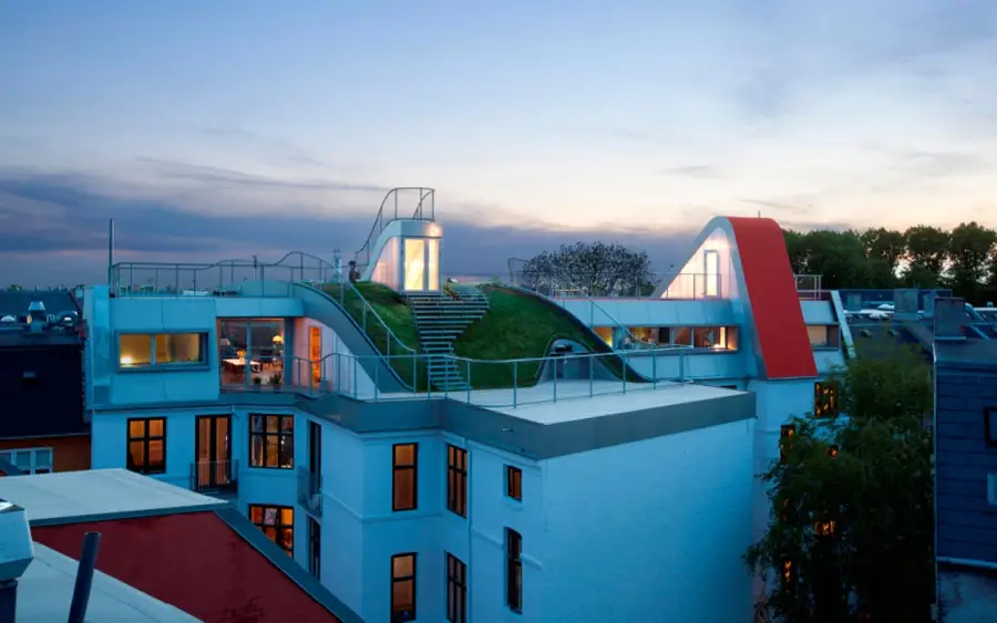 El distrito Elmegade es probablemente una de las zonas más densamente pobladas de Nørrebro, Copenhague. Cuando se encargó la construcción de tres áticos al estudio de arquitectura jds, éstos se propusieron rescatar aquel jardín perdido bajo el inmenso bloque, un espacio al que denominaron Hedonistic rooftop penthouses.