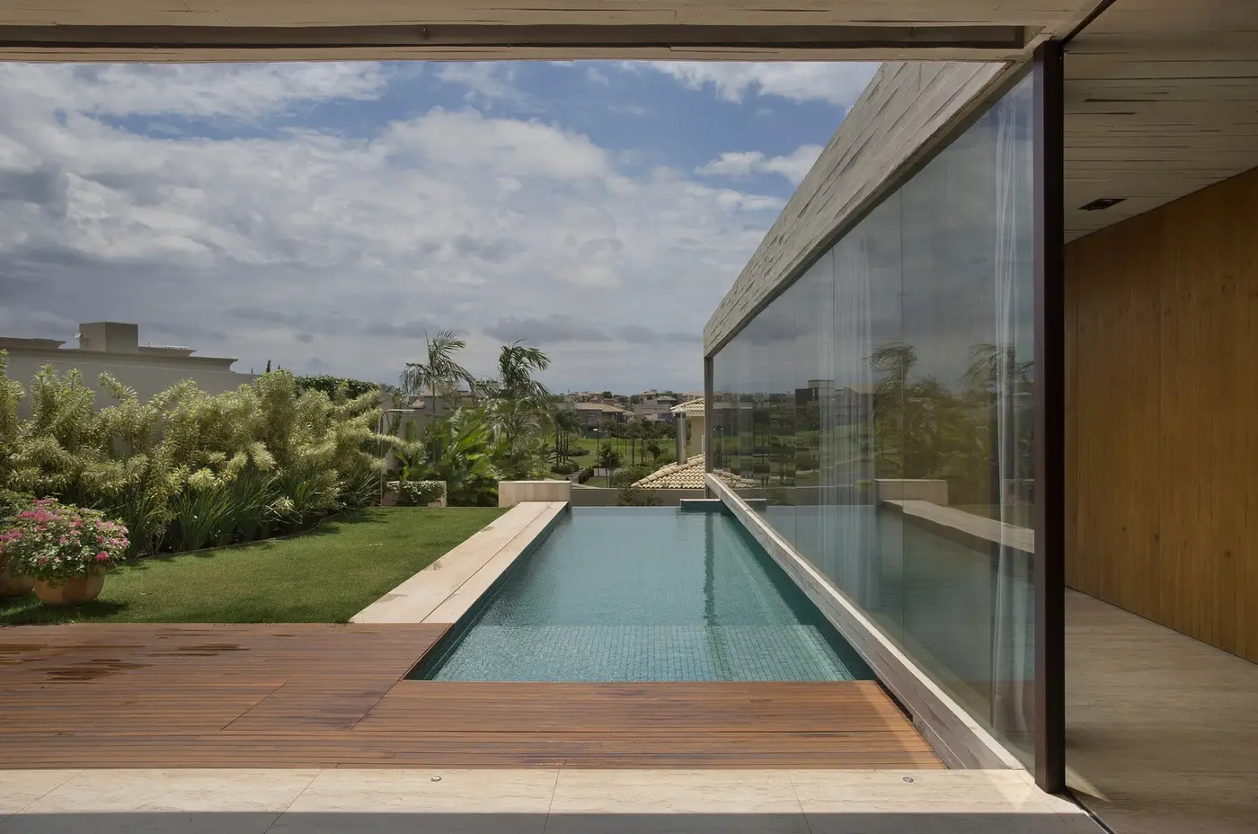 Interior y exterior se integran, se extienden y se funden, en una residencia moderna y acogedora en la que juegan un papel primordial el hormigón de la estructura con la textura de los tablones de madera, la propia madera cumaru que se emplea en revestimientos y en la pasarela, y suelos de mármol travertino Navona. Una división eficiente de los espacios, del salón, de la cocina, de las habitaciones, permite disfrutar de las vistas también en los tránsitos, apreciando el campo de golf del condominio tras la infinity pool.