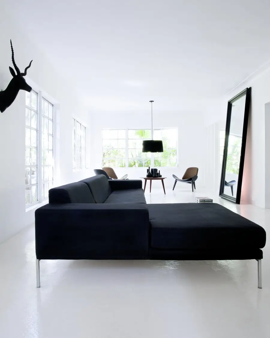 Encontramos detalles modernos, muy de diseño actual como el contraste del blanco absoluto con su opuesto en un salón de sofá negro, sin que esta ausencia de color ensombrezca lo más mínimo la estancia pues estamos en una casa que se llena de luz tropical al estar abierta a su jardín.
