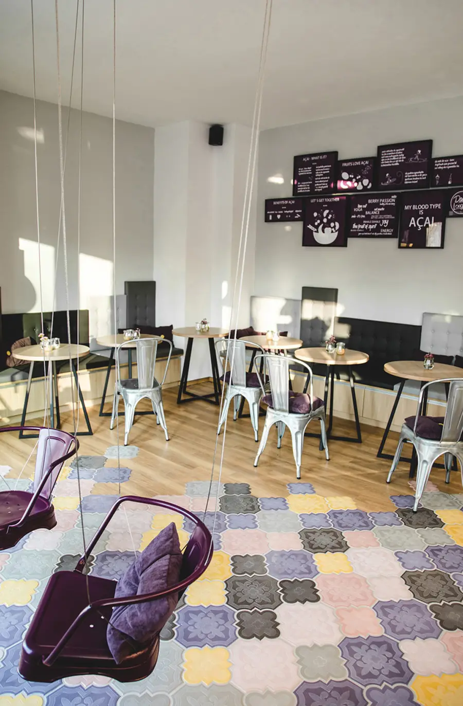 La cafetería Daddy Longlegs Açai Café de Munich es el colmo del diseño, con sillas suspendidas como columpios.